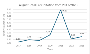 Over the past few years, Athens, OH has been seeing a downward trend in total August rainfall. Based on data from CoCoRaHS Data Explorer, the average total rainfall between the years of 2017 and 2022 was 4.05 inches; from 2017 to 2023, the Scalia Laboratory weather tower observed an average total rainfall of 3.22 inches in the month of August. 2021 saw above-average rainfall totals due to remnants of a tropical storm that sat over Athens County, allowing for a day of continuous rainfall. Otherwise, the monthly totals ranged from around 2.30 inches to 3.00 inches, visualized with Figure 1.